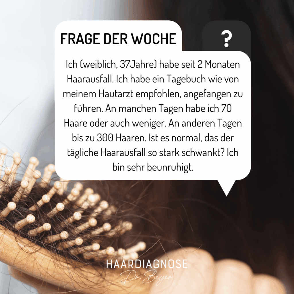 Warum Stress Haarausfall auslösen kann – und wie Sie den Teufelskreis durchbrechen Die Ironie des Haarausfalls Viele Patientinnen und Patienten beschreiben es so: „Mein Haarausfall macht mich gestresst – und mein Stress lässt mir die Haare ausfallen.“… Warum Stress Haarausfall auslösen kann – und wie Sie den Teufelskreis durchbrechen weiterlesen - Frage der Woche: „Ich wasche meine Haare kaum noch, weil ich jedes Mal so viele verliere. Sollte ich lieber nur einmal im Monat waschen?“