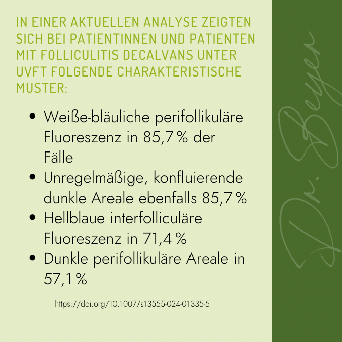 Folliculitis decalvans lässt sich durch eine Kombination aus klinischer Untersuchung, klassischer Trichoskopie und – ergänzend – UV-induzierter Fluoreszenztrichoskopie mit hoher diagnostischer Sicherheit erfassen. Besonders die typischen Zeichen wie Tufting, starburst scale und lineare fibrotische Bänder sowie spezifische UV-Reflexe sollten bei jedem Verdacht auf FD systematisch gesucht werden.