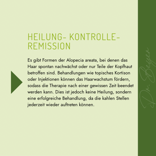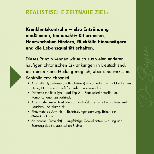 Dieses Konzept trifft auf Alopecia areata derzeit nicht zu. Die Erkrankung gehört zu den chronischen, immunvermittelten Erkrankungen, bei denen eine Kontrolle der Krankheitsaktivität möglich ist, nicht jedoch eine dauerhafte Ausschaltung der Ursache.