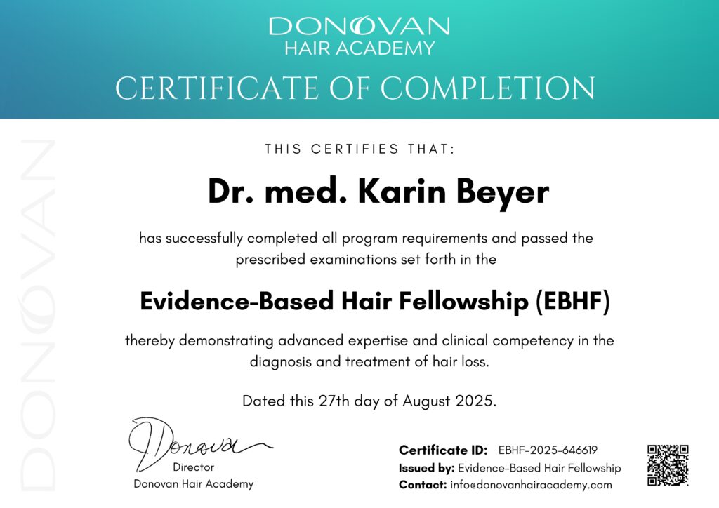 Ein bedeutender Meilenstein: Evidenzbasierte Haarmedizin Nach 87 Wochen intensiven Lernens und internationalen Austauschs habe ich das Evidence-Based Hair Fellowship (EBHF) der Donovan Hair Academy abgeschlossen. Warum evidenzbasierte Haarmedizin zählt Patient:innen mit Haarausfall verdienen mehr als Versprechen. Sie… Ein bedeutender Meilenstein: Evidenzbasierte Haarmedizin weiterlesen - Menopause: Haarveränderungen sind mehr als nur eine Hormonfrage