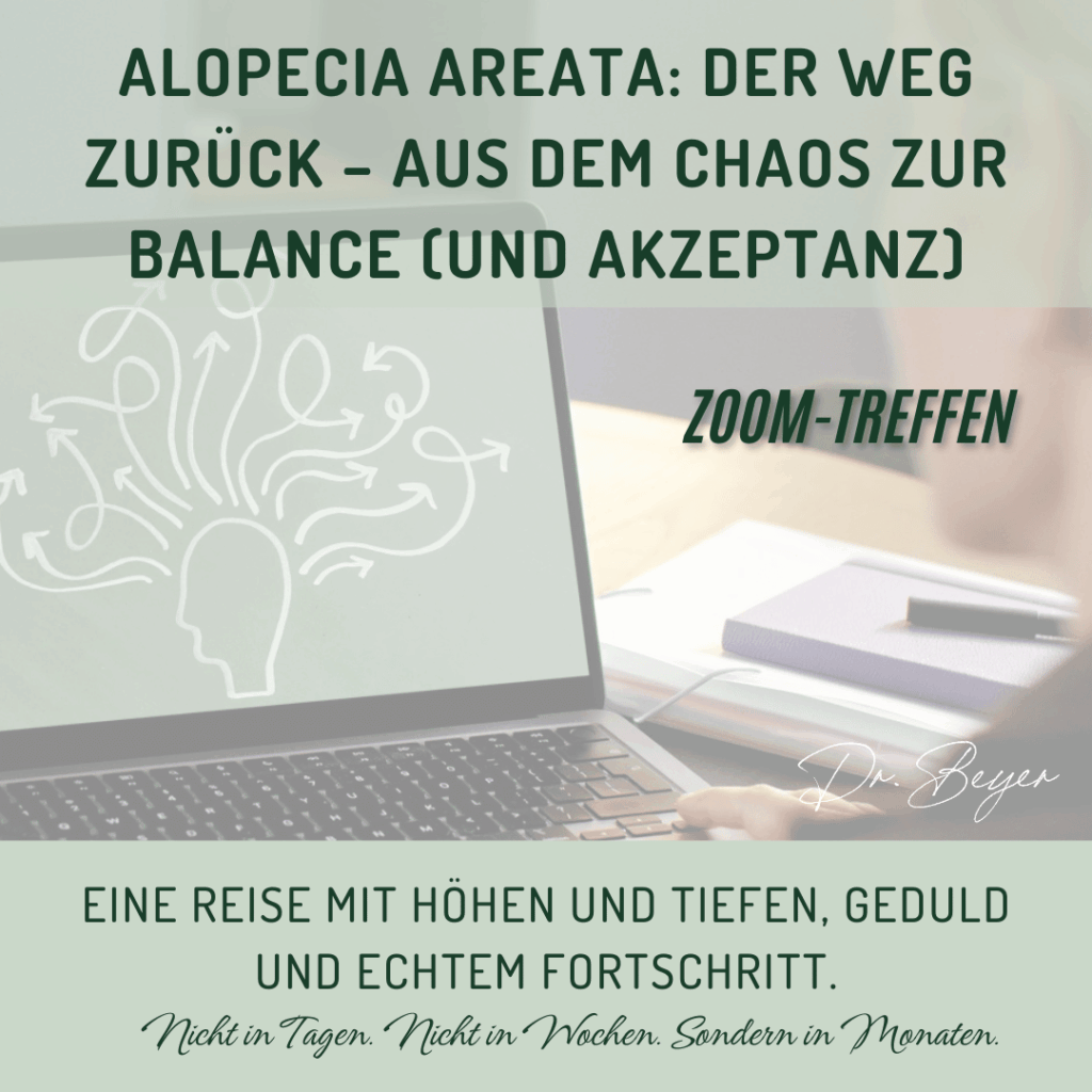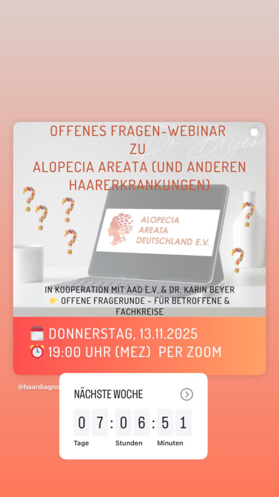 August – Monat der Aufmerksamkeit für HaarausfallEin Plädoyer für mehr Sichtbarkeit Haarausfall ist kein Randthema. Er betrifft Millionen Menschen – sichtbar, emotional belastend und oft unterschätzt. Im August richtet sich der Blick international auf genau dieses Thema:… August – Monat der Aufmerksamkeit für Haarausfall Ein Plädoyer für mehr Sichtbarkeit weiterlesen - Einladung zum Zoom-Meeting – „ Neu betroffen von Alopecia Areata? Du hast gerade die Diagnose Alopecia Areata erhalten oder vermutest, betroffen zu sein?