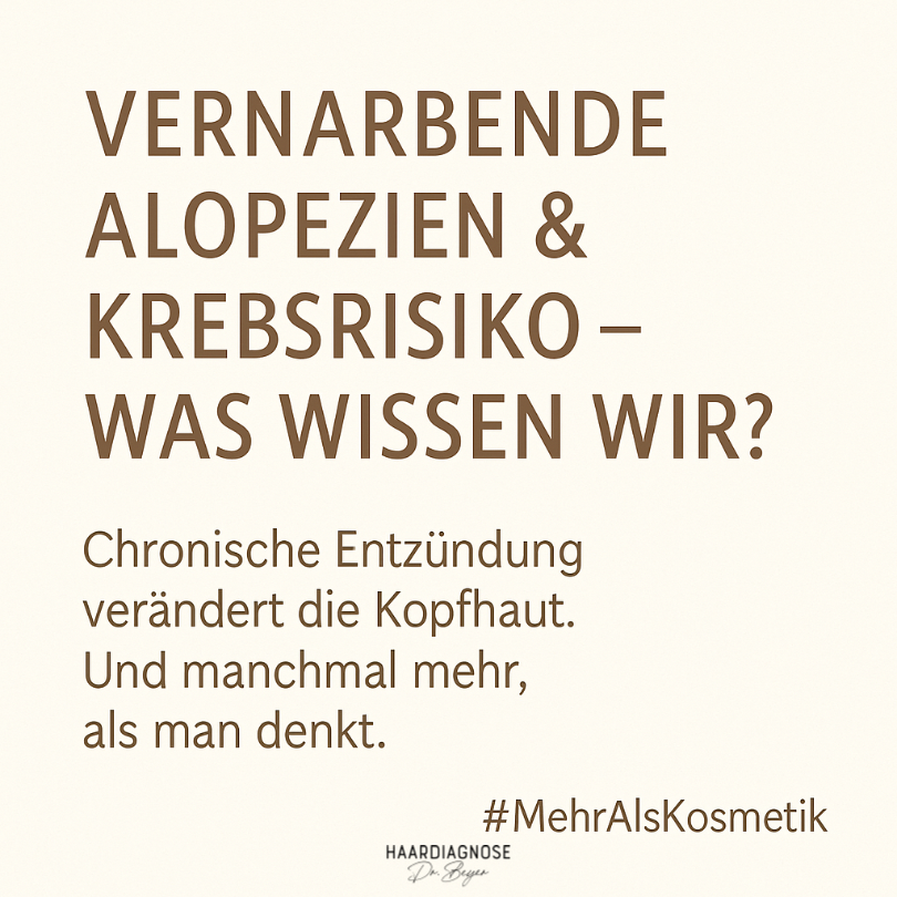 Frage vom Q&A Seminar November 2025: Welche psychologischen Hilfsangebote sind für Kinder und Erwachsene mit Alopecia empfehlenswert? Als jemand, der täglich mit Menschen arbeitet, die unter Haarausfall leiden, sehe ich, wie tief diese Veränderungen wirken können. Haare… Frage vom Q&A Seminar November 2025: « Welche psychologischen Hilfsangebote sind für Kinder und Erwachsene mit Alopecia empfehlenswert? » weiterlesen - Vernarbende Alopezie & Krebsrisiko – Was wir wissen sollten