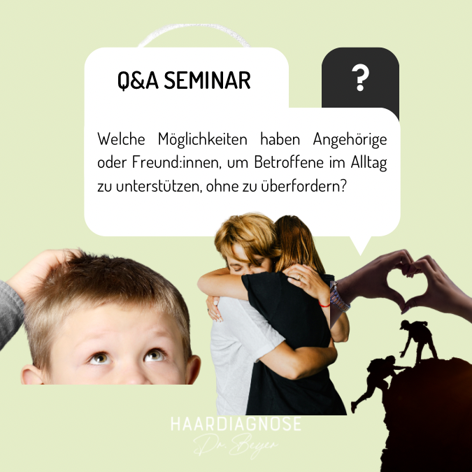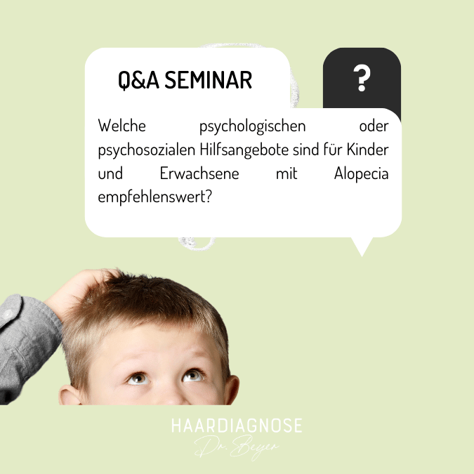 Frage aus dem Q&A Webinar: „Wie können Angehörige oder FreundInnen Betroffene unterstützen, ohne sie zu überfordern?“ Diese Frage wurde im Seminar gestellt. Aus dermatologischer Sicht und aus vielen Jahren Haarsprechstunde lässt sich Folgendes gut zusammenfassen: FazitUnterstützung bedeutet… Frage aus dem Q&A Webinar: „Wie können Angehörige oder FreundInnen Betroffene unterstützen, ohne sie zu überfordern?“ weiterlesen - Frage vom Q&A Seminar November 2025: « Welche psychologischen Hilfsangebote sind für Kinder und Erwachsene mit Alopecia empfehlenswert? »