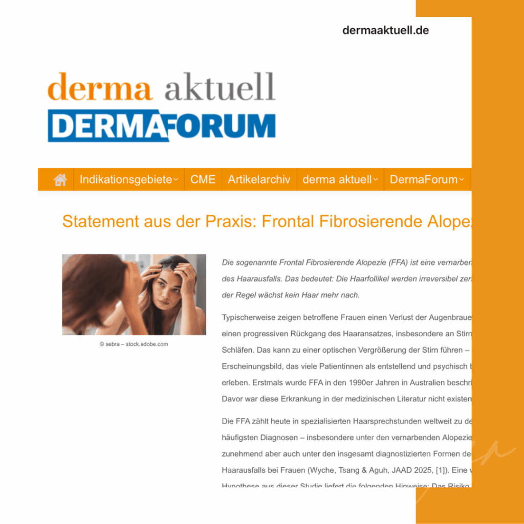 Vernarbende Alopezie & Krebsrisiko – Was wir wissen sollten Bei meinem Vortrag im Rahmen der Quartalsfortbildung der LMU München am 12. November 2025 habe ich das Thema bewusst hervorgehoben: Zwischen vernarbenden Alopezien und einem erhöhten Hautkrebsrisiko besteht… Vernarbende Alopezie & Krebsrisiko – Was wir wissen sollten weiterlesen - Statement aus der Praxis: Frontal Fibrosierende Alopezie