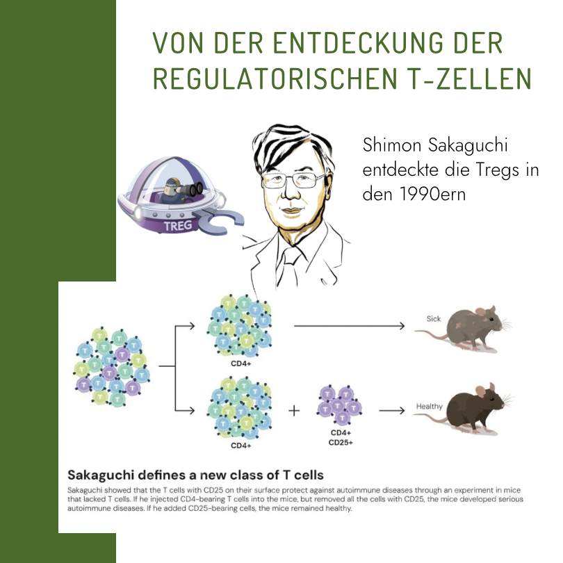 Sakaguchi (Japan) und die Geburt der Tregs: 1995 zeigte Sakaguchi, dass eine bestimmte T-Zell-Population mit CD4⁺CD25⁺ Immunreaktionen unterdrücken kann. Mäuse ohne diese Zellen entwickelten schwere Autoimmunerkrankungen. Er nannte sie: regulatorische T-Zellen .