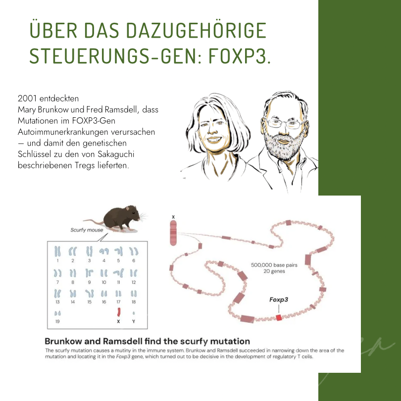 Brunkow & Ramsdell (USA) und das FOXP3-Gen: Parallel fanden Brunkow und Ramsdell bei „scurfy“-Mäusen eine Mutation im bis dahin unbekannten Gen FOXP3. Diese Tiere entwickelten eine fatale Autoimmunerkrankung . Später zeigte sich: Die menschenbezogene Variante dieser Mutation verursacht das IPEX-Syndrom – eine lebensbedrohliche Autoimmunerkrankung bei Kleinkindern. FOXP3 wurde darüberhinaus als zentrales Steuerungsgen für Tregs identifiziert .