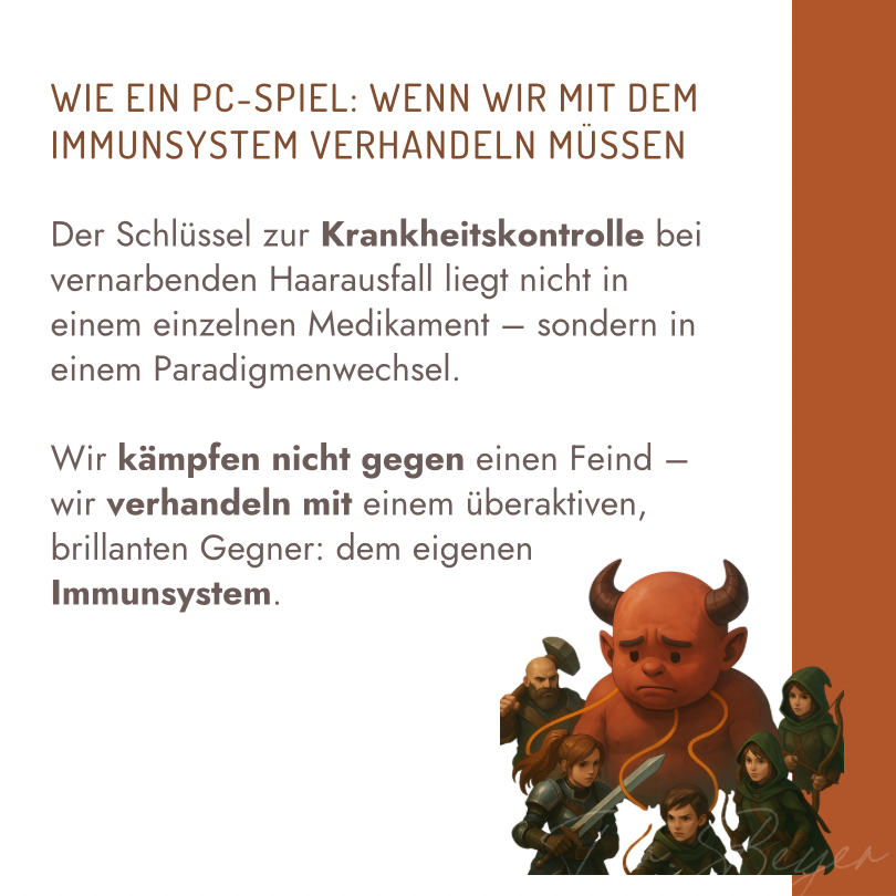 Ganz ähnlich ist es, wenn wir gegen das Immunsystem arbeiten müssen – oder besser gesagt: mit ihm verhandeln. Denn bei vielen Haarerkrankungen wie Alopecia areata, Lichen planopilaris, Frontal fibrosing alopecia oder Discoidem Lupus haben wir es nicht mit einem Feind zu tun, den man einfach „besiegen“ kann. Wir stehen vielmehr einem brillanten, lernfähigen Gegner gegenüber – dem eigenen Immunsystem.